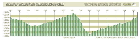 • According to the Department of Labor, preliminary figures show that Connecticut gained 600 payroll positions in June. This follows the addition of 5,900 jobs in May (revised down from a preliminary figure of 6,400 jobs). Connecticut has gained 27,000 jobs over the past 12-month period, which brings total payroll employment in the state to 1,691,900. Over the entire 2014 calendar year, the state added 25,100 payroll positions.