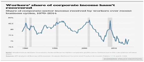 • Between 1980 and 2014 labor income as a share of GDP has declined from 58.4 percent to 52.2 percent. This decline has also ocurred in labor's share of corporate income.